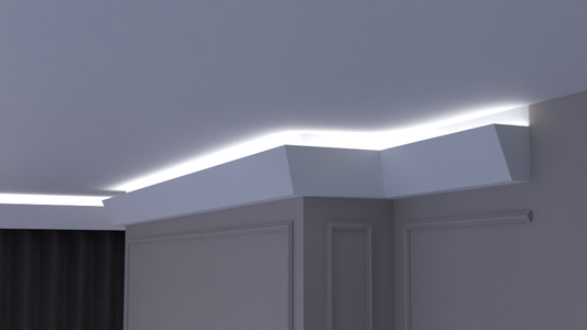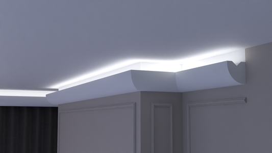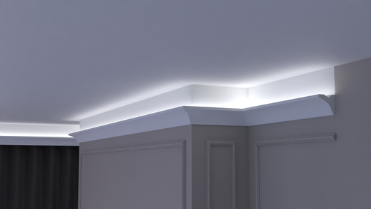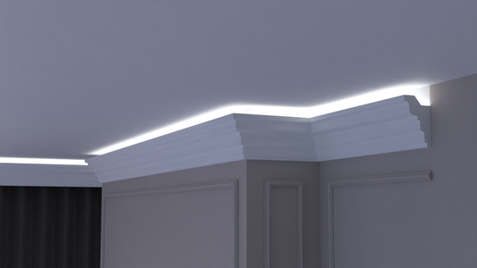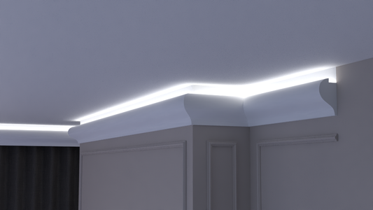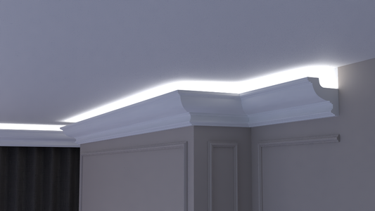 Profil Decorativ din Polistiren pentru Tavane de Interior CIL0001, folosit ca si cornisa pentru Bandă LED de dimensiuni 90x115x2000