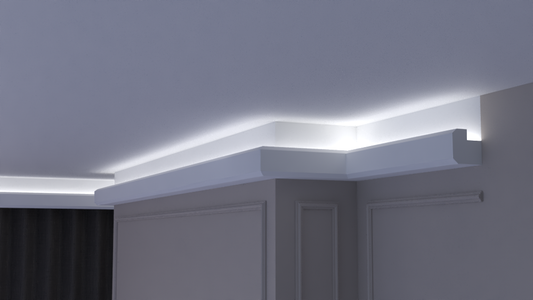 Profil Decorativ din Polistiren pentru Tavane de Interior CIL0002, folosit ca si cornisa pentru Bandă LED de dimensiuni 100x100x2000